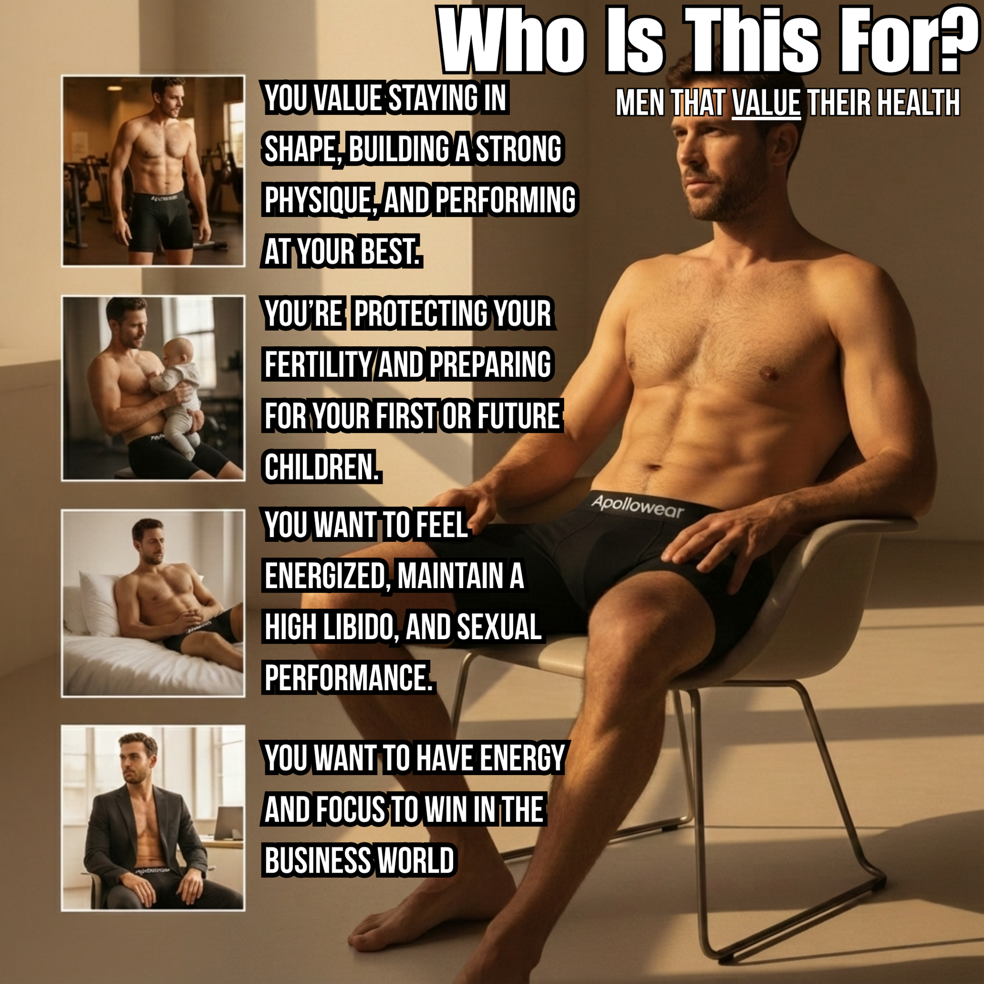 Apollowear is engineered around one simple truth: men perform better when their body stays cool where testosterone is made. By reducing excess heat around the testes, Apollowear supports healthy testosterone function, energy, and desire. Comfortable enough for all-day wear, invisible under clothing, and easy to use, it’s the simplest upgrade you can make for confidence, performance, and long-term male health.